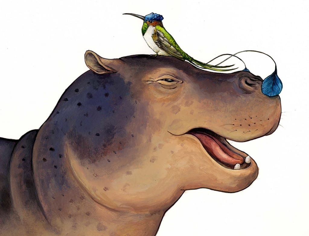 Neulich bin ich vom vielen Fliegen müde geworden. Da wollte ich mich ausruhen. Auf einemStein. Am Ende stellte sich heraus: Der Stein war gar kein Stein. Es war Nilpferdson. Da bin ich aber erschrocken. Dasselbe ist mir schon mal passiert. Da habe ich Schildegard mit einem Stein verwechselt. So haben wir uns kennen gelernt. Mit ihrem Bäumchen sieht sie ja auch aus wie ein Stein.